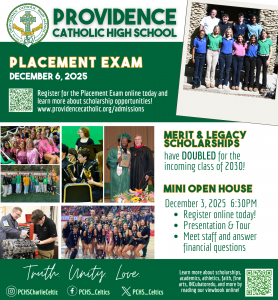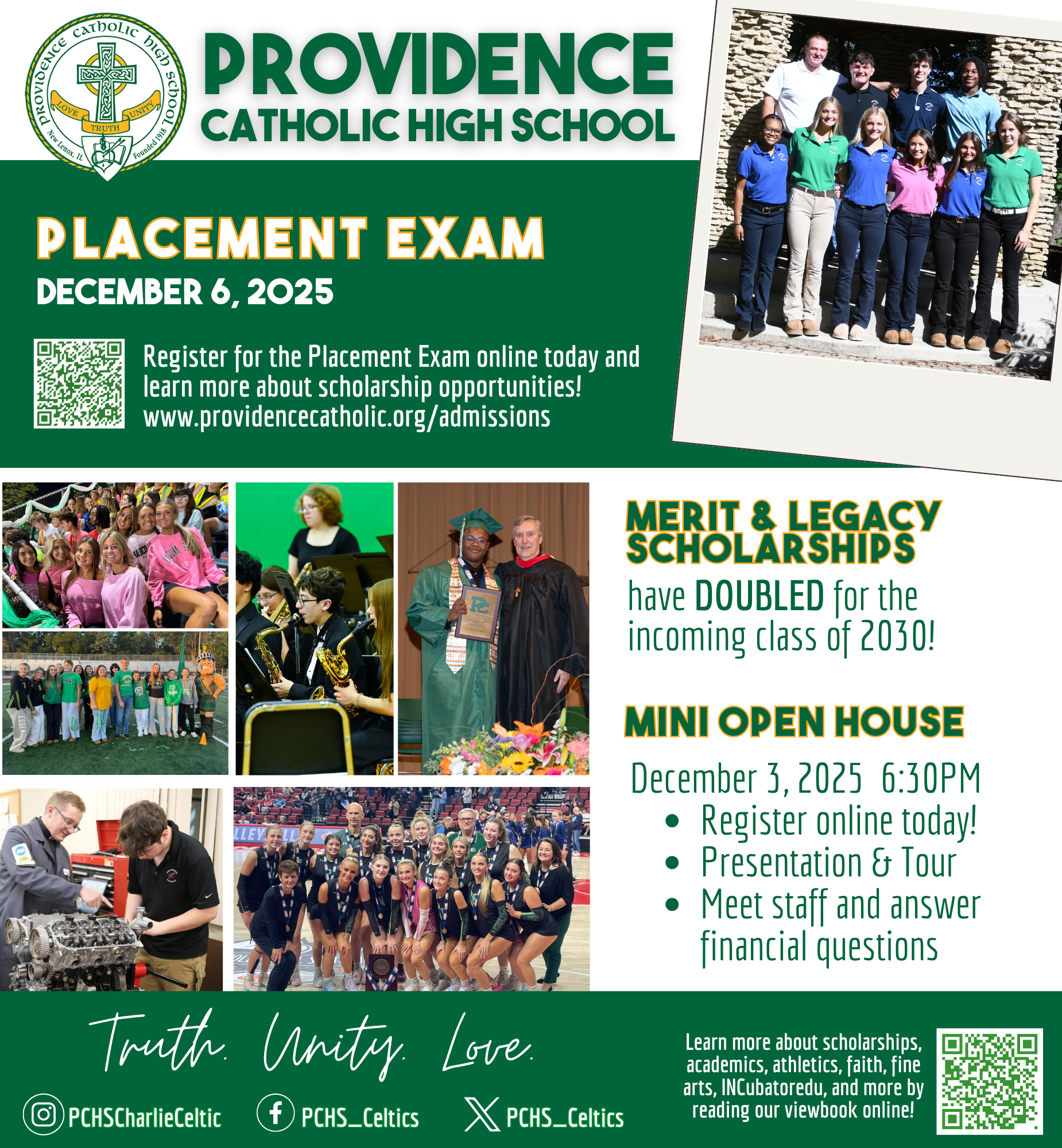 News Stay up to date with all things Providence Catholic! Check out the latest news, announcements, and highlights from our students, faculty, and community. Placement Exam & Mini Open House 8th Grade Families, sign up for the Open House and Placement Exam today! Learn more about scholarships, tour times, and more on the Admissions page. Admissions Discover if Providence Catholic is the right fit for your family - explore our community, values, and opportunities to see how we can help your student thrive. Faith & Service Rooted in the Augustinian tradition, our faith life is woven into every school day through prayer, liturgy, retreats, a four-year Theology curriculum, and service requirement. Academics At Providence Catholic, we believe that all students can learn. We provide each student with a four-year college preparatory course of study. We have academic supports for students who need additional preparation to master our college preparatory program via our learning resource program in the CLC. We also offer honors and Advanced Placement courses to challenge our gifted academic students. Athletics With 33 state championships and 64 state trophies - the most of any private high school in Illinois - Providence Catholic is a powerhouse of athletic excellence! Support PCHS The Annual Fund bridges the gap between tuition payments and operating costs. A gift to the Annual Fund ensures that we are able to keep our college preparatory standard and reputation of excellence, often referred to as THE PROVIDENCE DIFFERENCE. Spirit Shop Show your Celtic pride! Explore our Spirit Shop for gear, apparel, and accessories to cheer on Providence Catholic in style. Calendar Never miss a moment! Check our calendar for upcoming events, games, and important dates at Providence Catholic. Register for the Placement Exam Today! © 2025 Providence Catholic High School