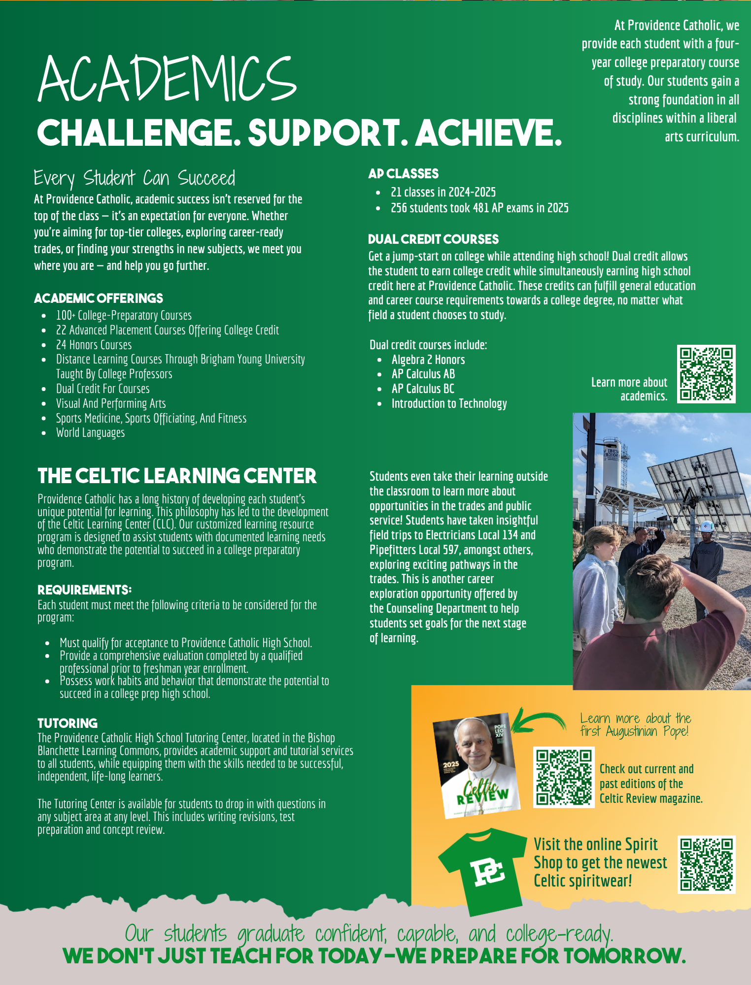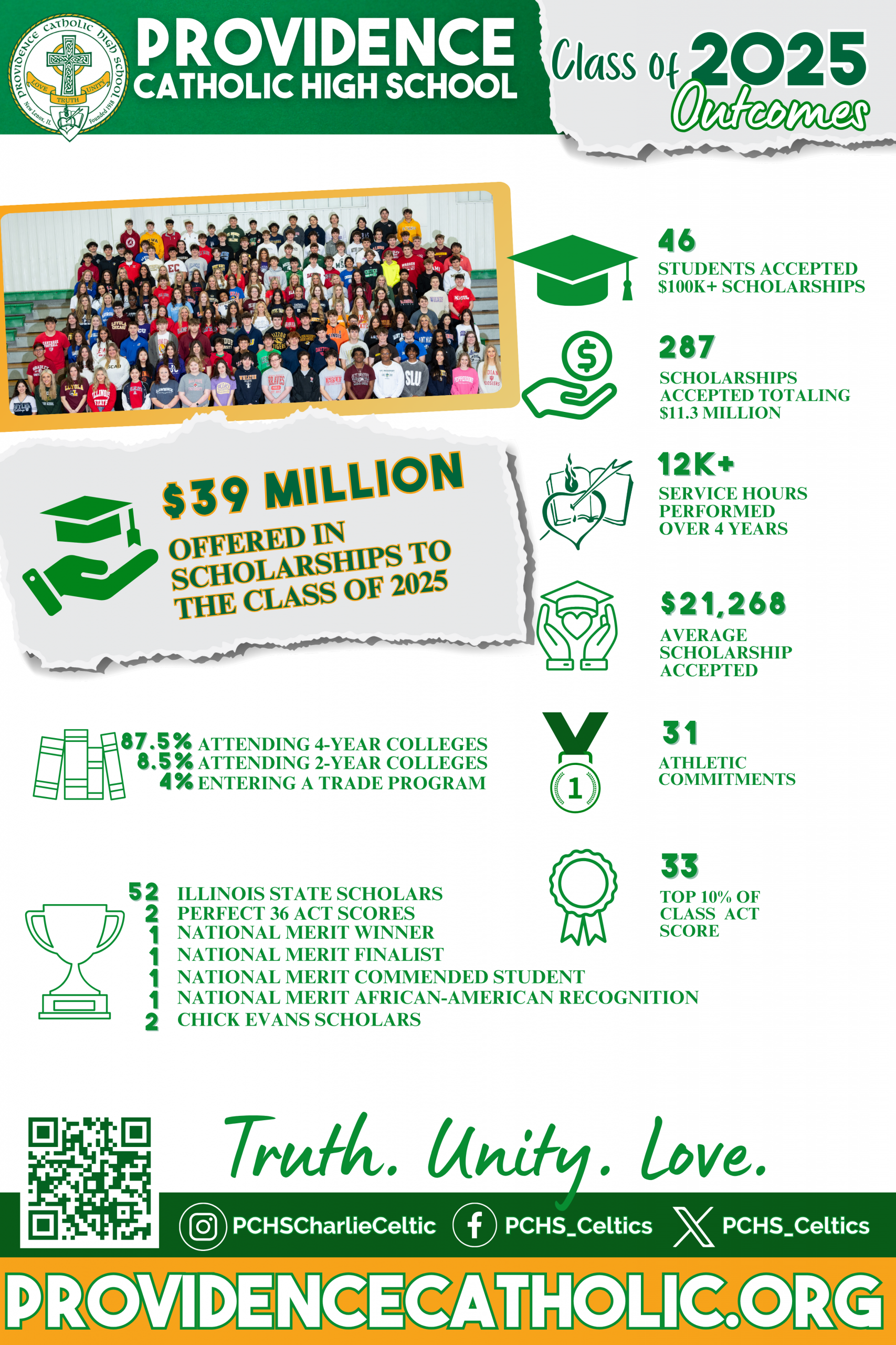 At Providence Catholic, academics aren’t just a requirement – they’re a launching pad. Our students thrive in a rigorous, college-preparatory environment supported by passionate teachers, individualized guidance, and advanced pathways in STEM, humanities, fine arts, and business innovation. With consistently high success on AP exams, impressive college scholarships, and nearly one-third of our students recognized as Illinois State Scholars each year, Providence students are prepared to lead, achieve, and excel at the next level. Discover what it means to learn with purpose – and become something greater.
