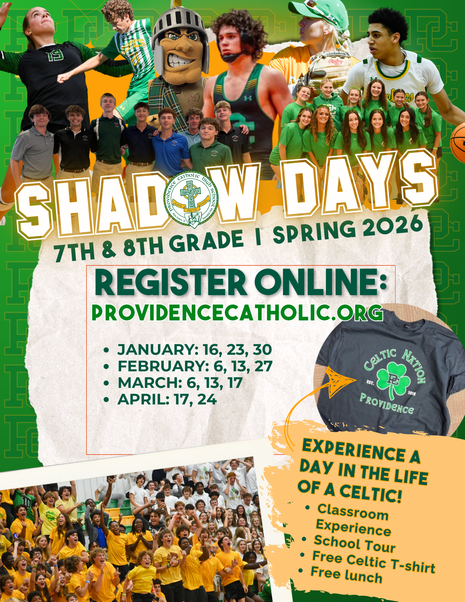 Prospective students are able to shadow a current PCHS student for the day. Students are here for the entire day and get to participate in actual class time, meet with extracurricular moderators and coaches, meet faculty and staff and experience a day in the life of a Celtic! This opportunity is open to 7th & 8th graders! Register below.