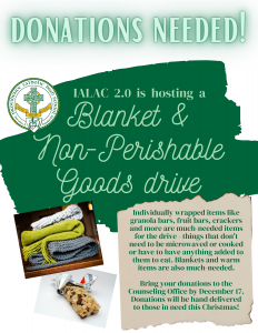 IALAC 2.0 is sponsoring a drive to help those in need. They are collecting blankets and other warm items, as well as non-perishable goods that don’t need to be heated. Items will be personally delivered! Please drop off your donations to the Counseling Office by Friday, Dec. 17. See flyer linked at right for full details and a list of items needed.