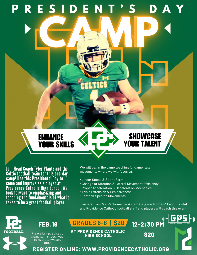 Join Head Coach Tyler Plantz and the Celtic football team for this one-day camp! Use this Presidents’ Day to come and improve as a player at Providence Catholic High School. We look forward to emphasizing and teaching the fundamentals of what it takes to be a great football player.