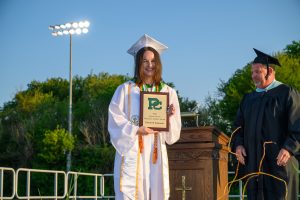 NEW LENOX (May 24, 2023) – Each graduation, the Providence Catholic High School Athletic Department honors seniors with its two most prestigious awards – the Jaime Garcia Scholastic Athlete Award and the Senior Athletic Spirit Award. On May 20, 2023, Mr. Doug Ternik, Athletic Director at Providence Catholic, called the two awardees to the stage to receive their awards.