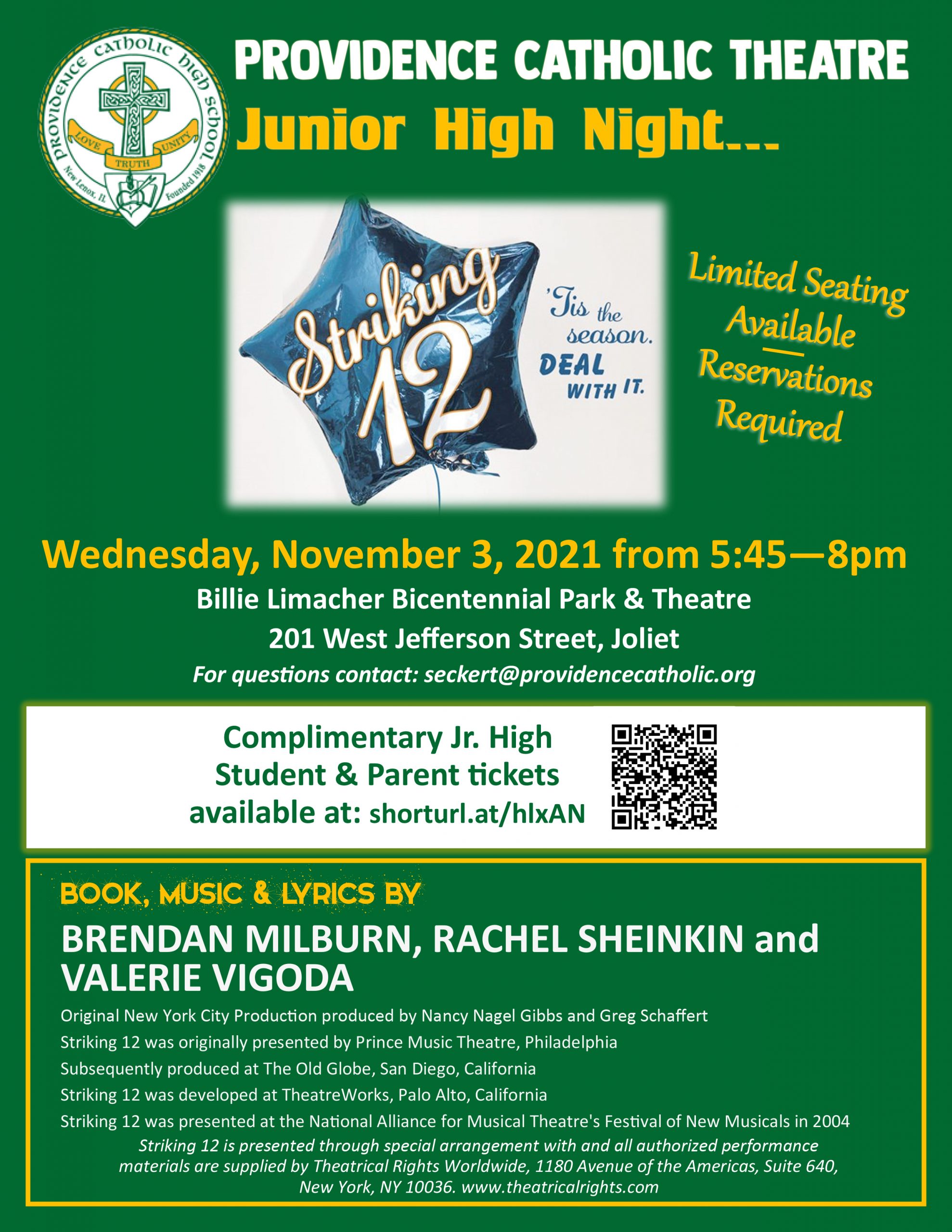 - Wed Nov 3 is Jr. High Night: See the flyer here! Junior high students are welcome to join us (with complimentary admission) for a preview of the show!