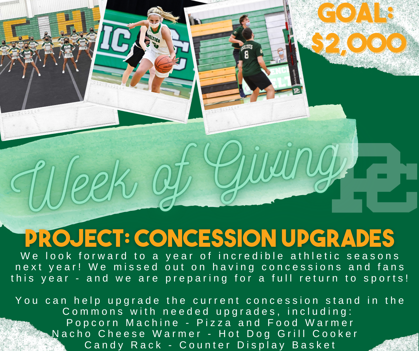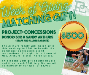 We look forward to a year of incredible athletic seasons next year! We missed out on having concessions and fans this year – and we are preparing for a full return to sports! Click on the Make A Gift button and choose the project you would like to support! To start us off, the Arthurs family has made a generous matching gift of $500 – so your gift counts for double!